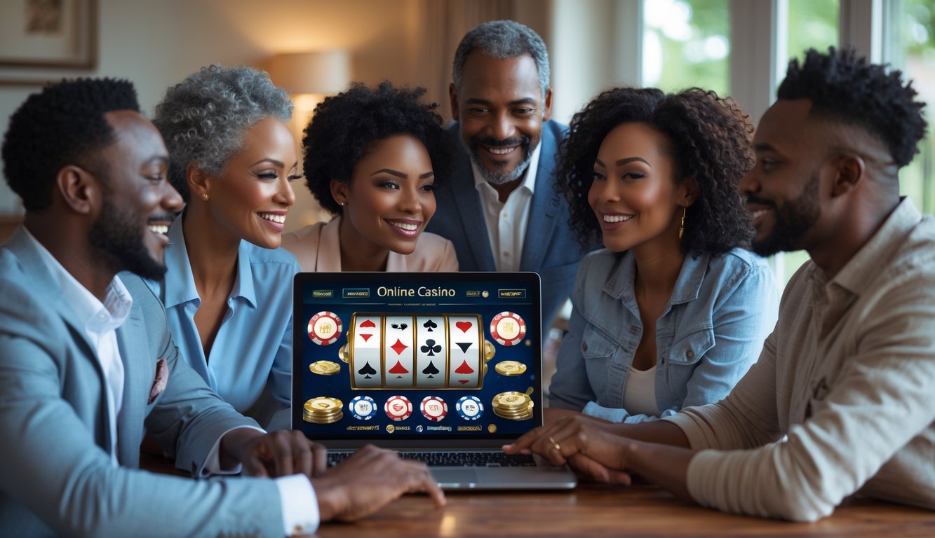 Sekelompok orang dewasa sedang menggunakan laptop bersama di ruang tamu yang nyaman dengan layar menampilkan permainan kasino online.